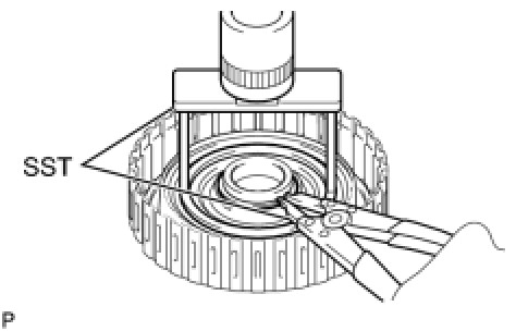 (b) Using needle-nose pliers, attach the snap ring to install the ring gear to the forward multiple disc clutch assembly.