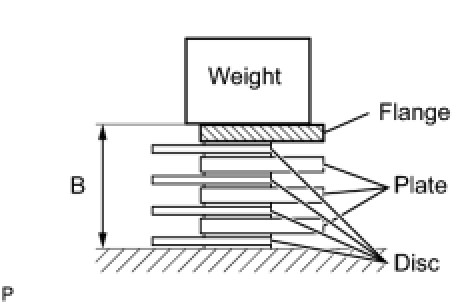 (b) Assemble the 4 No. 2 brakes discs, 3 No. 2 brake plates, and No. 2 brake flange as shown in the illustration. Then with a weight fixture of 500 g (17.64 oz) or less placed on the flange, measure length B. *2