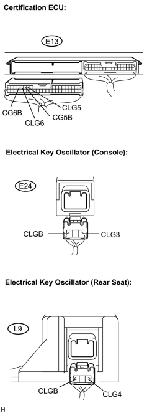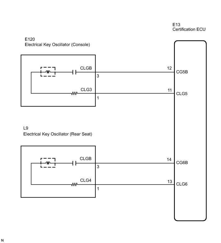 The certification ECU activates the electrical key oscillators (console and rear seat). The power is supplied from the certification ECU to both the electrical key oscillators (console and rear seat). The electrical key oscillators (console and rear seat) circuits have the same wiring. If the smart access system with push-button start does not operate properly inside the vehicle, check both the electrical key oscillators (console and rear seat) circuits.