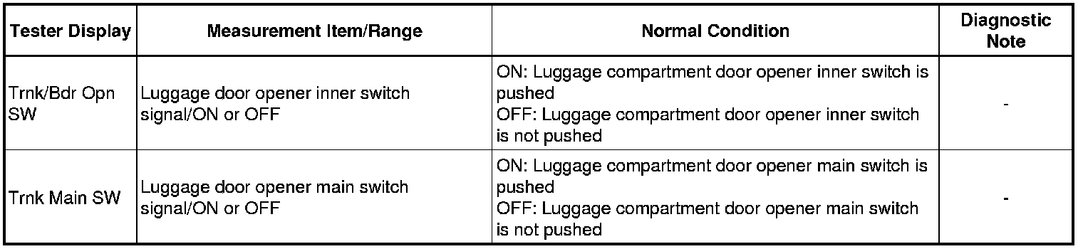 ENGINE HOOD / DOOR: LUGGAGE COMPARTMENT DOOR OPENER SYSTEM: DATA LIST / ACTIVE TEST