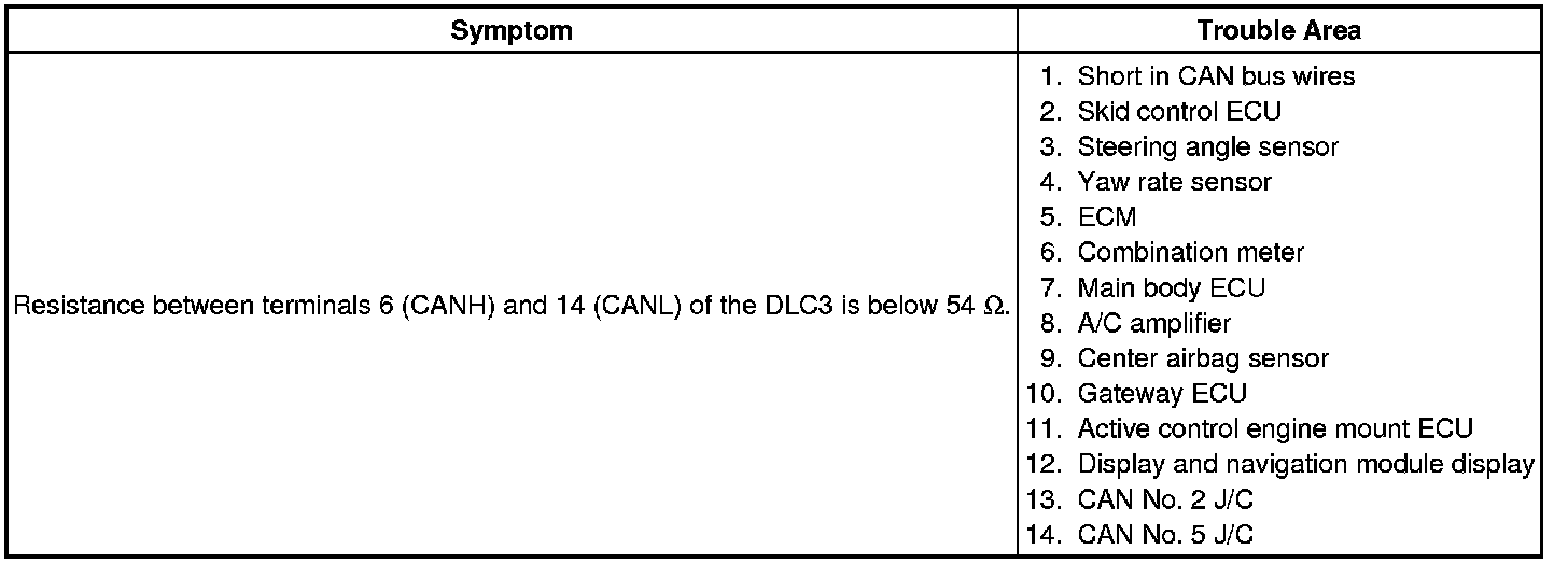 The CAN bus wires are considered to be shorted when the resistance between terminals 6 (CANH) and 14 (CANL) of the DLC3 is below 54 Ohms.