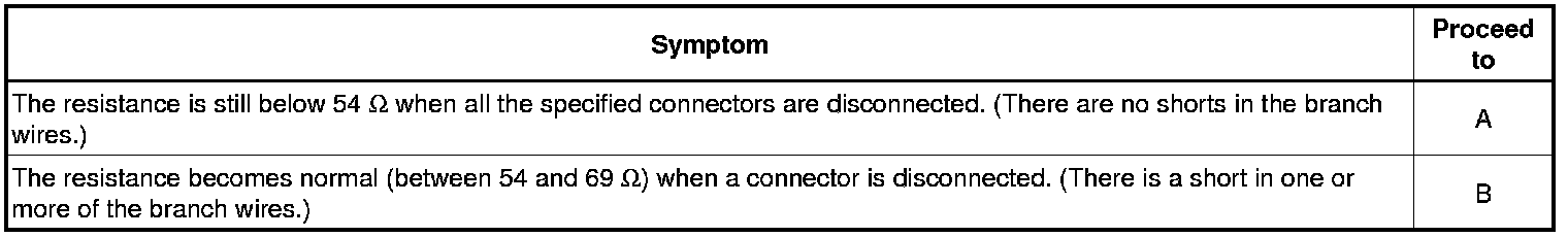 If the resistance becomes normal (between 54 and 69 Ohms) when the connector is disconnected from the ECU (or sensor), there may be a short in the ECU (or sensor).