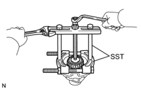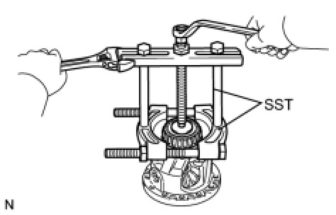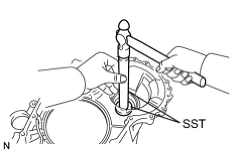 (a) Using SST, remove the front differential case rear tapered roller bearing from the differential case.