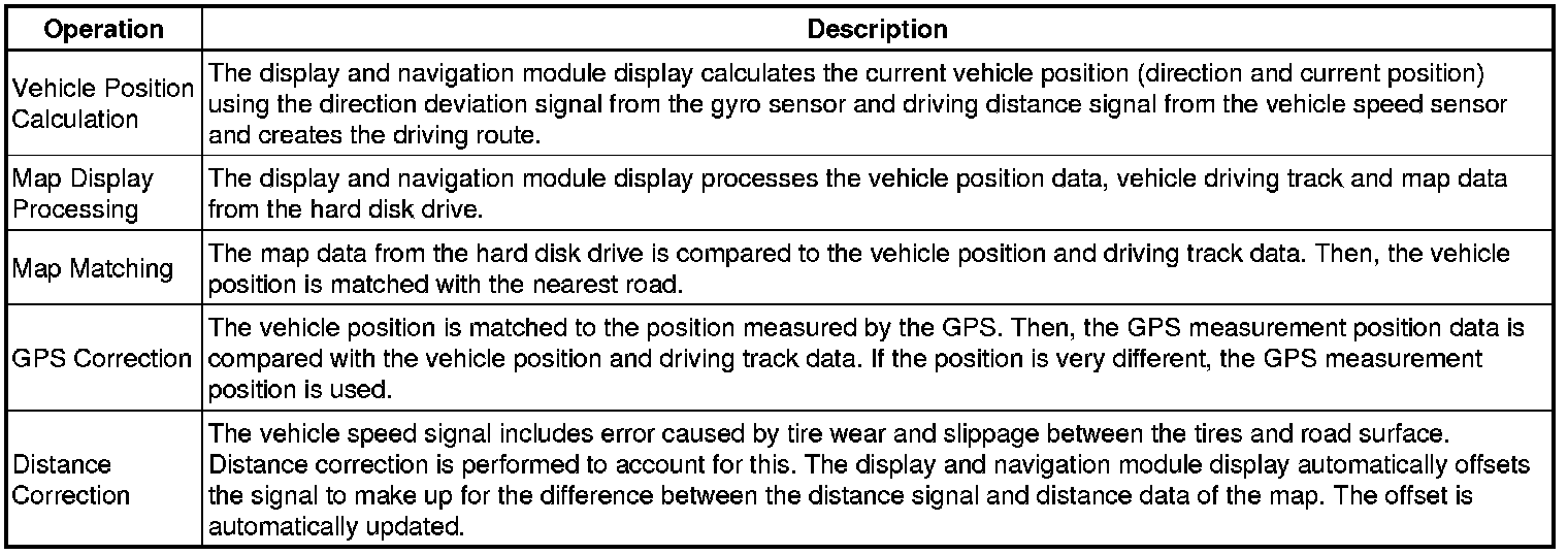 The current driving route is calculated by autonomous navigation (according to the gyro sensor and vehicle speed sensor) and GPS navigation. This information is then compared with possible road shapes from the map data in the hard disk drive and the vehicle position is set onto the most appropriate road.