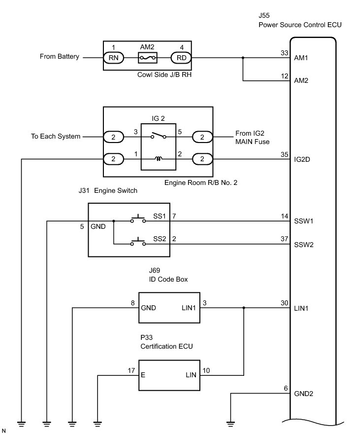 11. CHECK WIRE HARNESS (POWER SOURCE CONTROL ECU AND BODY GROUND - ENGINE SWITCH)