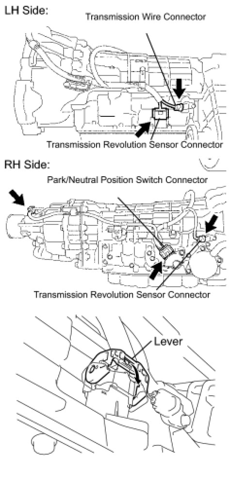 (c) Disconnect the park/neutral position switch connector, transmission wire connector and 2 transmission revolution sensor connectors.