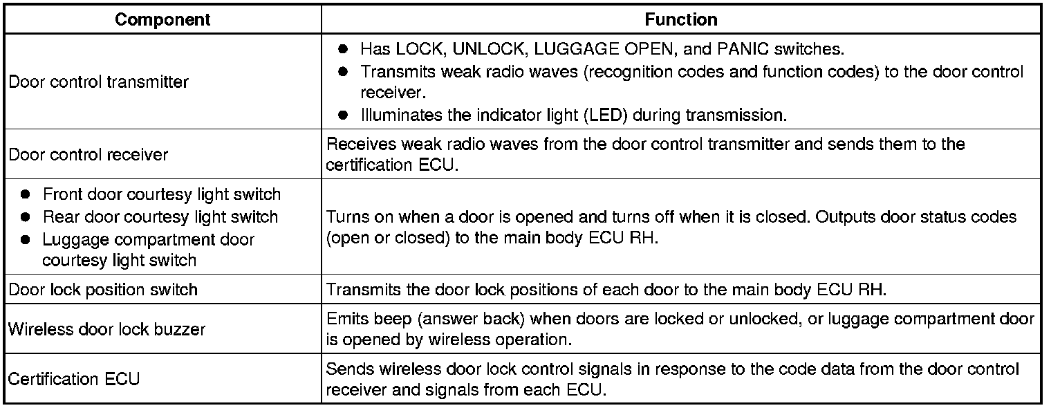 The wireless door lock control system functions to lock and unlock all the doors from a distance. The system is controlled by a hand-held transmitter which sends radio waves to the door control receiver. The main body ECU RH performs an ID code identification process and engages the door lock control.