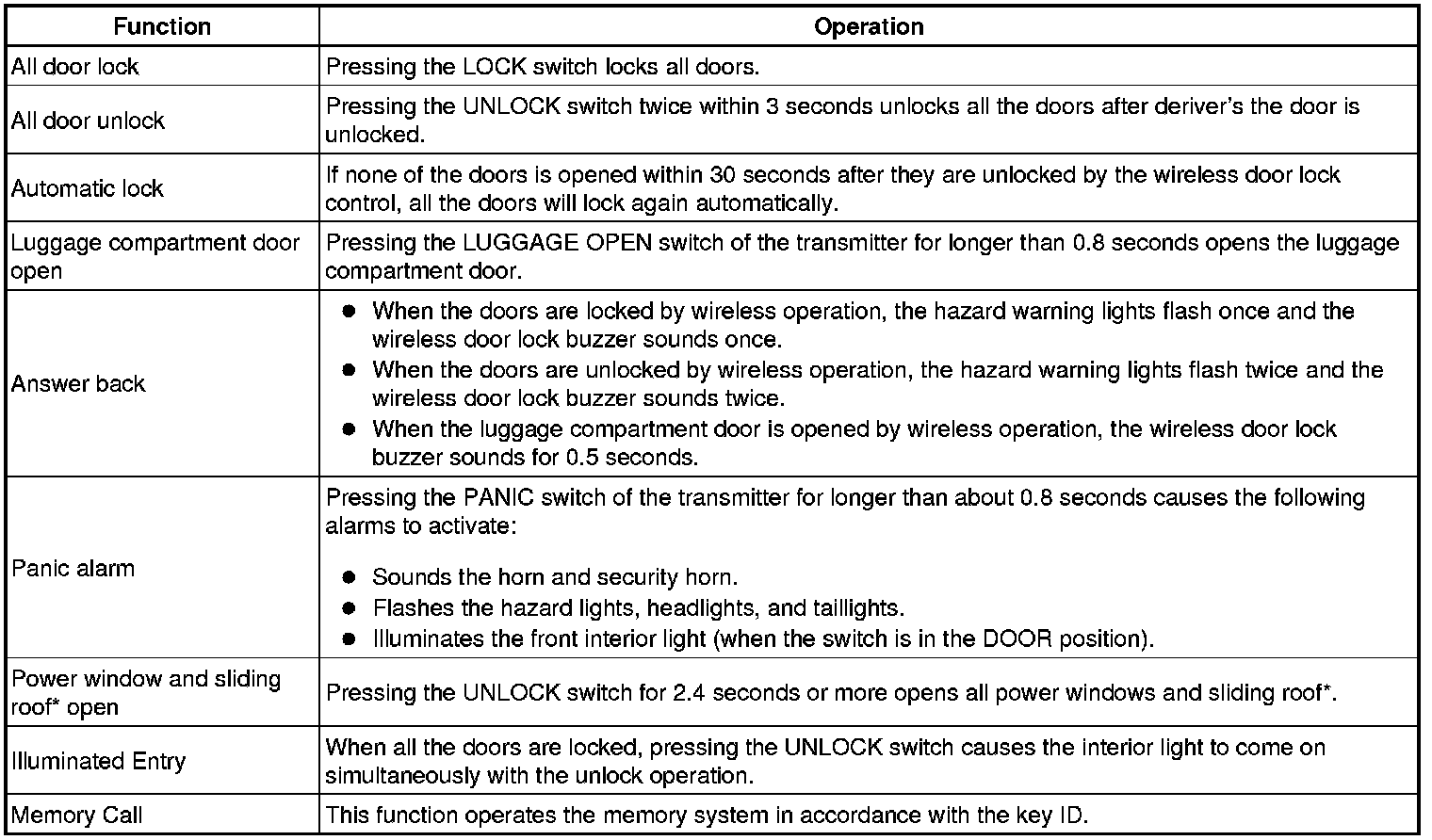 The door control transmitter has LOCK, UNLOCK, LUGGAGE OPEN, and PANIC switches. Operating these switches activates each function.