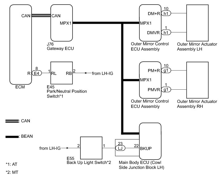 The main body ECU (cowl side junction block LH) detects the condition of the back up light switch. The main body ECU (cowl side junction block LH) also sends a back up light switch signal to the outer mirror control ECU via the sends a back up light switch signal to the outer mirror control ECU via the BEAN communication system. The outer mirror control ECU controls the reverse shift-linked function based on the back up light switch signal.