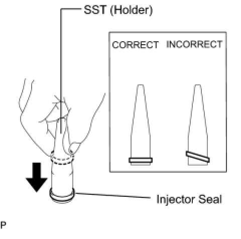 Be careful not to install the injector seal to SST (holder) at an angle. Doing so will stretch the seal and correcting this problem is very complicated.