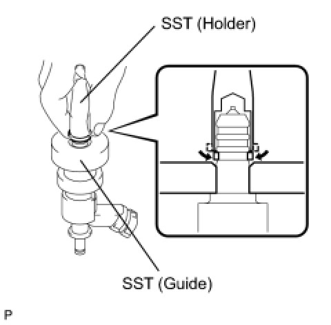 (i) Using SST (holder), gently press downward on the injector seal (injector tip side). Then slowly slide SST (guide) towards the injector tip to settle the seal into the injector groove.