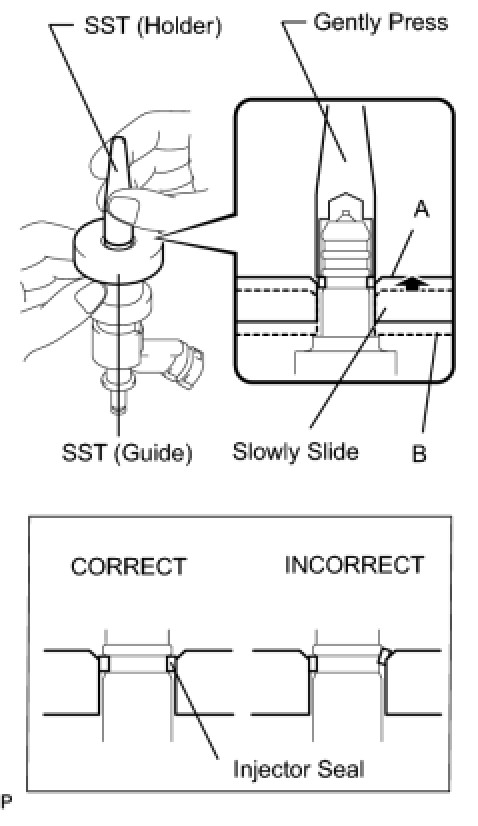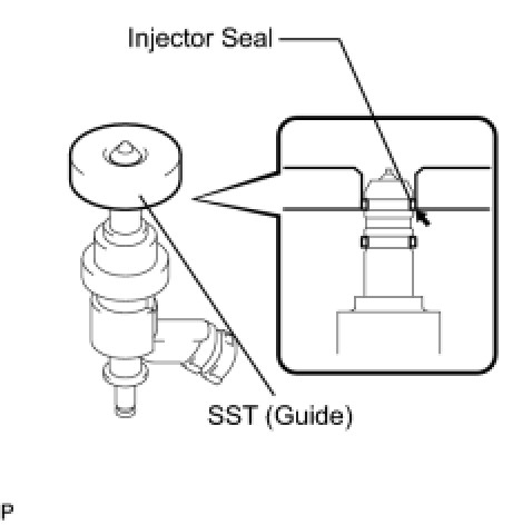 Be careful that the seal is not pinched between SST (guide) and the injector groove. Replace the seal if it becomes damaged.