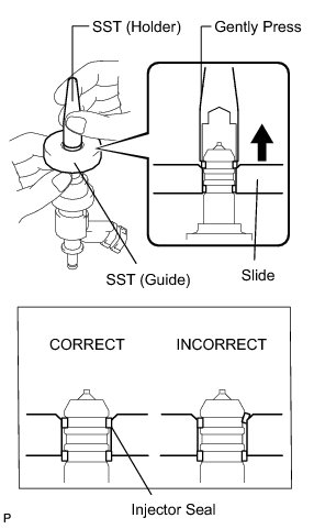 (e) Using SST (holder), gently press downward on the injector seal (injector connector side). Then slowly slide SST (guide) towards the injector tip to settle the seal into the injector groove.