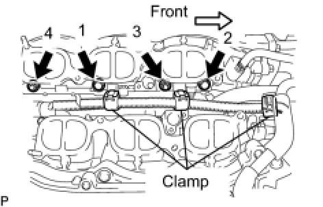 (d) Install the fuel delivery pipe by uniformly tightening the 2 bolts and 2 nuts in several passes in the order shown in the illustration.
