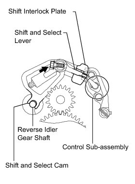 (d) Align the shift interlock plate and shift and select lever with the head of the control sub-assembly and insert the shift and select lever shaft to the front transmission case.