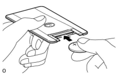 (c) Push in and install the transmitter battery (lithium battery (CR2412)) while being careful of the following: 1) the orientation of the battery positive (+) and negative (-) terminals; and 2) being sure to insert the battery between the 2 terminals and deep into the card, in the direction indicated by the arrow in the illustration.