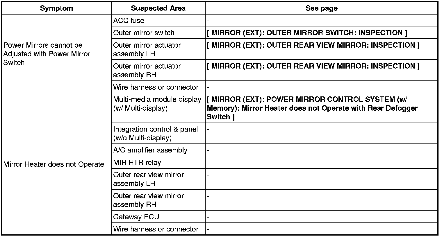 MIRROR (EXT): POWER MIRROR CONTROL SYSTEM (w/o Memory): PROBLEM SYMPTOMS TABLE