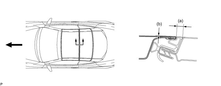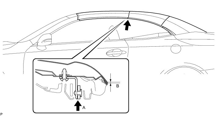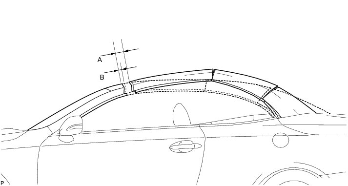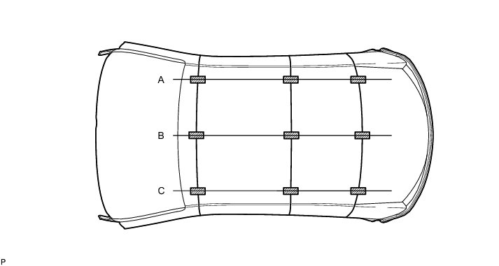 (p) Measure the clearance between the front window shield header and front slide roof panel sub-assembly at points A, B and C and adjust it to the standard.
