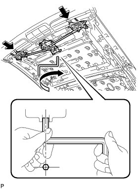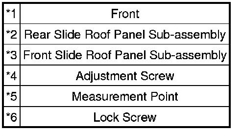 * If the roof panel movement is not within the specified range, turn the adjustment screw on the roof panel strength sub-assembly to adjust the amount of movement. Loosen the lock screw before turning the adjustment screw.