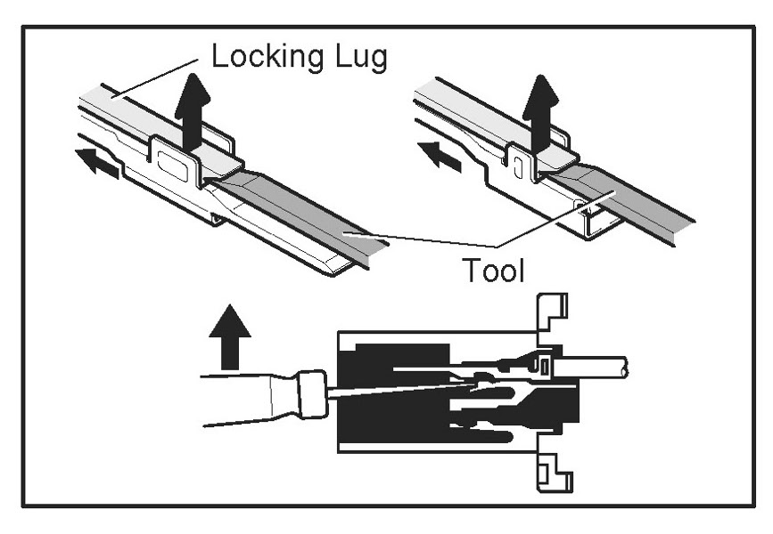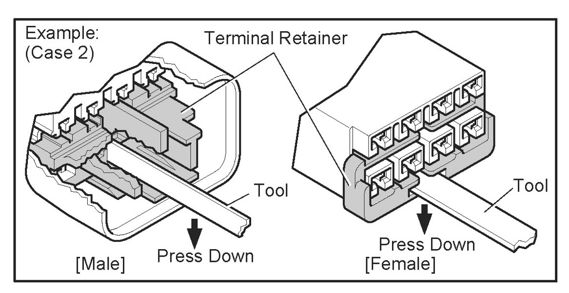 HINT: To remove the terminal from the connector, please construct and use the special tool or like object shown on the left.
