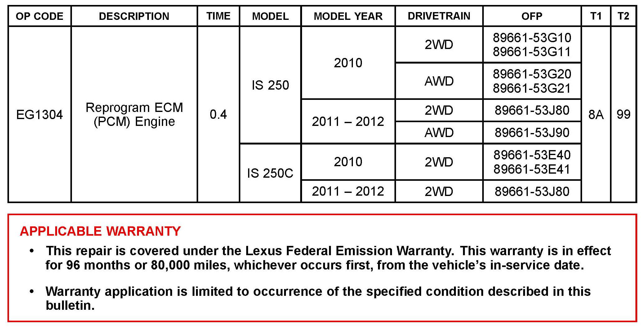Some 2010 - 2012 model year IS 250 and IS 250C vehicles equipped with automatic transmissions may exhibit a MIL "ON" condition with Diagnostic Trouble Codes (DTCs) P014C, P014D, P014E, or P014F present. The Engine Control Module/ECM (SAE term: Powertrain Control Module/PCM) logic has been modified to reduce the possibility of this condition occurring. Use the following procedure to reprogram the ECM (PCM).
