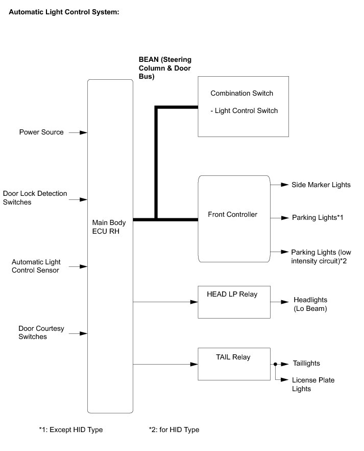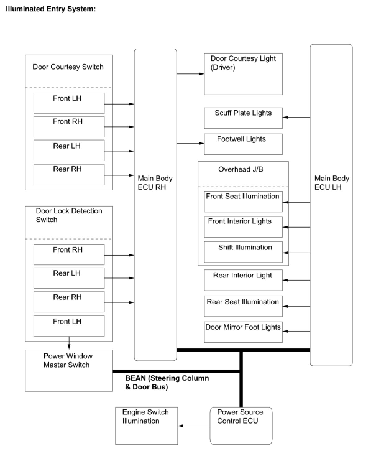 Various switches or sensors are represented as inputs for the different systems mentioned in the section. Where direct electrical connections do not exist between components, signals may be carried across the different networks (BEAN, CAN) that exist on the vehicle. If a signal needs to travel from the CAN network to the BEAN network, the gateway ECU allows the signal to travel between these different networks. Some of these different signals can be confirmed or inspected using the Techstream.