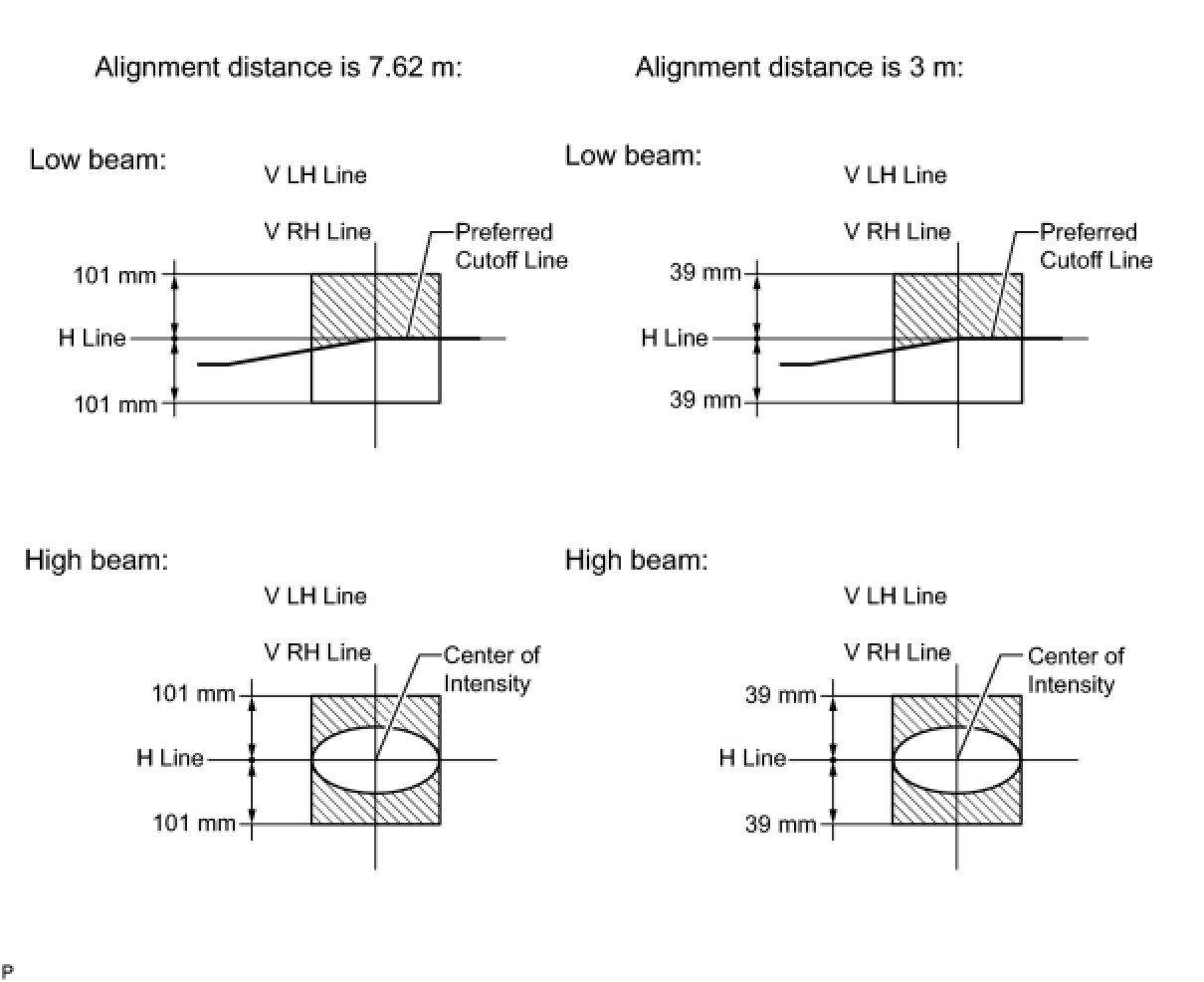 The high beam center of intensity should be within 101 mm (3.97 in.) above or below the H line (SAE J599).