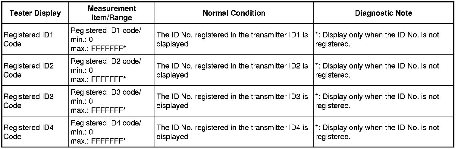 The transmitter ID is written on the tire pressure warning valve and transmitter. It will be unable to be read after installing the tire pressure warning valve and transmitter on the tire and wheel. Therefore, take a note of the transmitter ID before installing the tire pressure warning valve and transmitter.