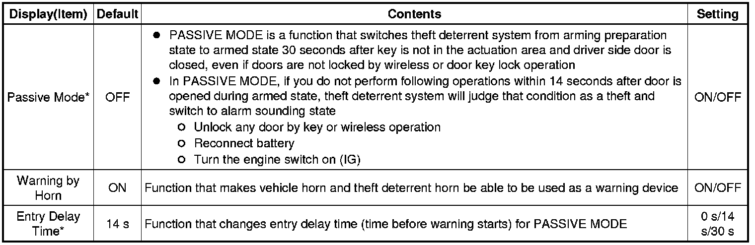 * *2: This function is linked with the power window wireless transmitter-linked function. If the power window wireless transmitter-linked function is set to OFF, the sliding roof wireless transmitter-linked function will not operate even when it is set to ON.