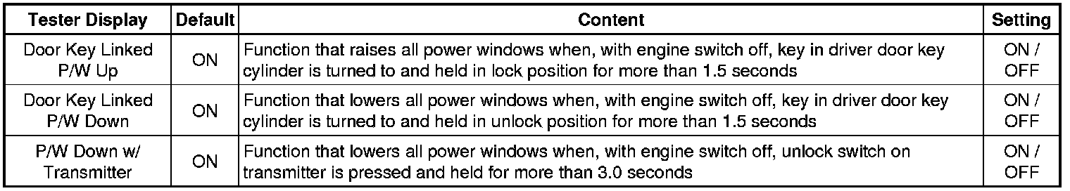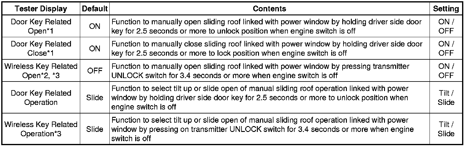 * *1: This function is linked with the power window key-linked function. If the power window key-linked function is set to OFF, the sliding roof key-linked function will not operate even when it is set to ON.