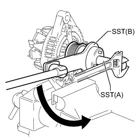 (f) Loosen the pulley by turning SST (B) in the direction shown in the illustration.