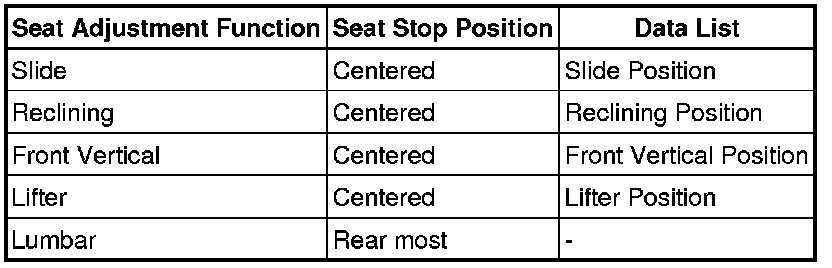 Refer to Data List for specifics regarding the seat stop positions Scan Tool Testing and Procedures.