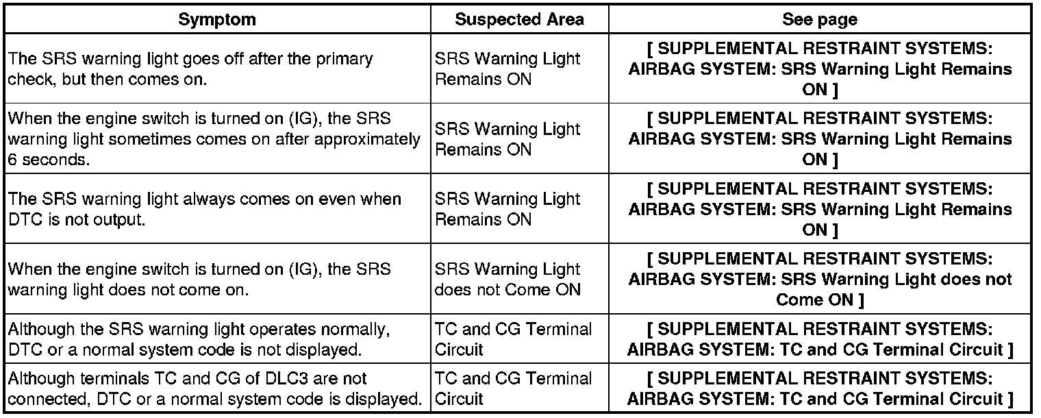 SUPPLEMENTAL RESTRAINT SYSTEMS: AIRBAG SYSTEM: PROBLEM SYMPTOMS TABLE