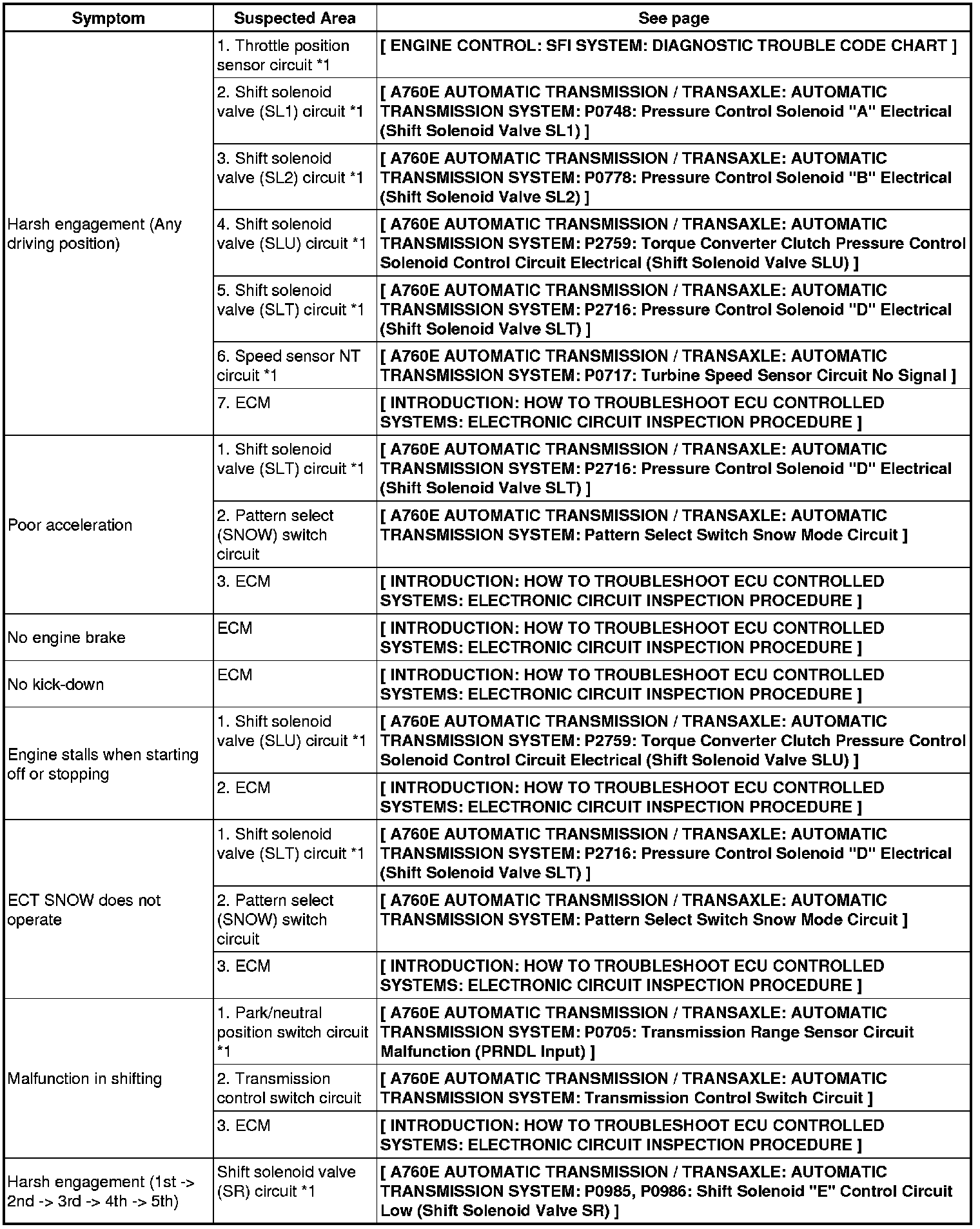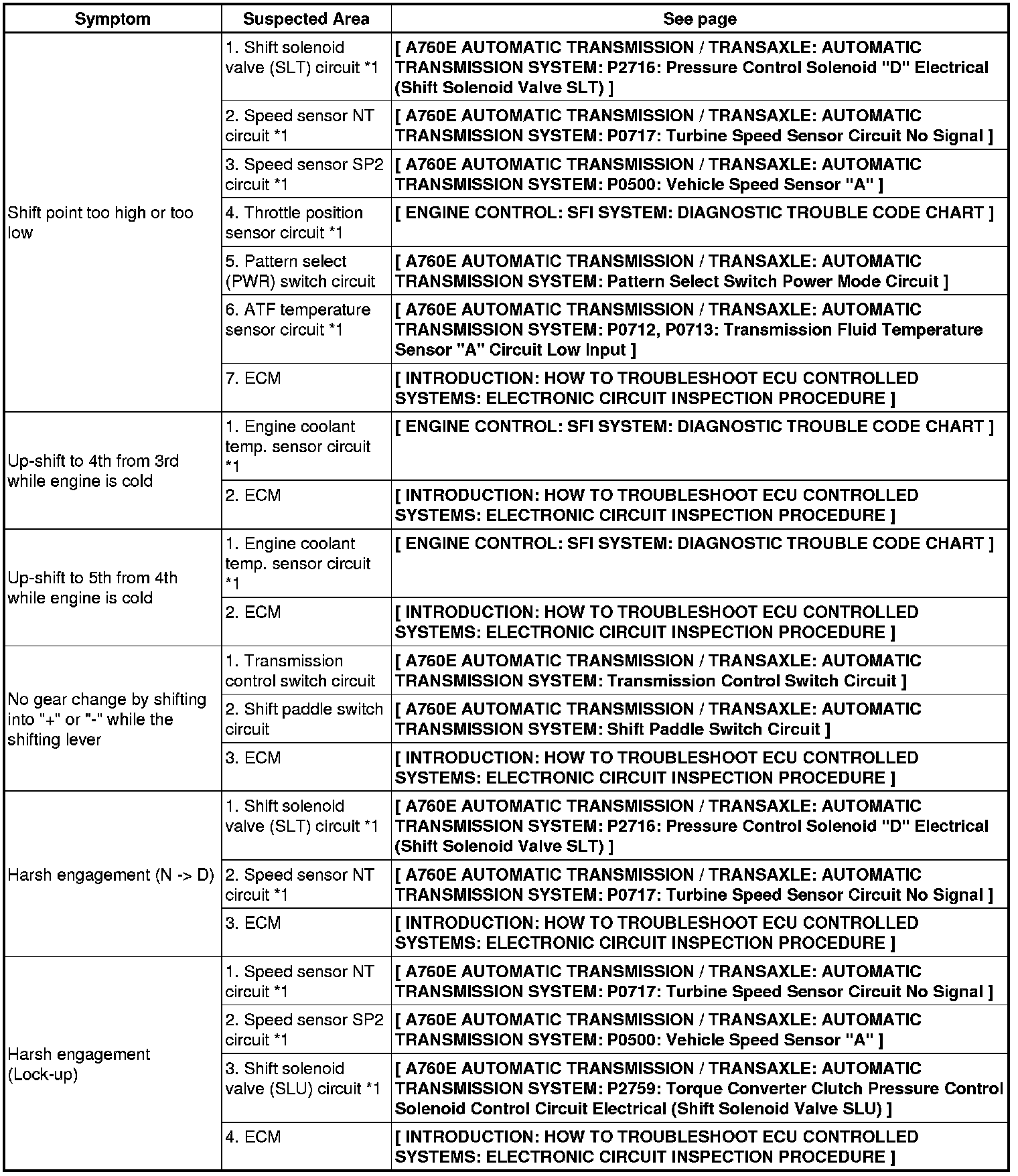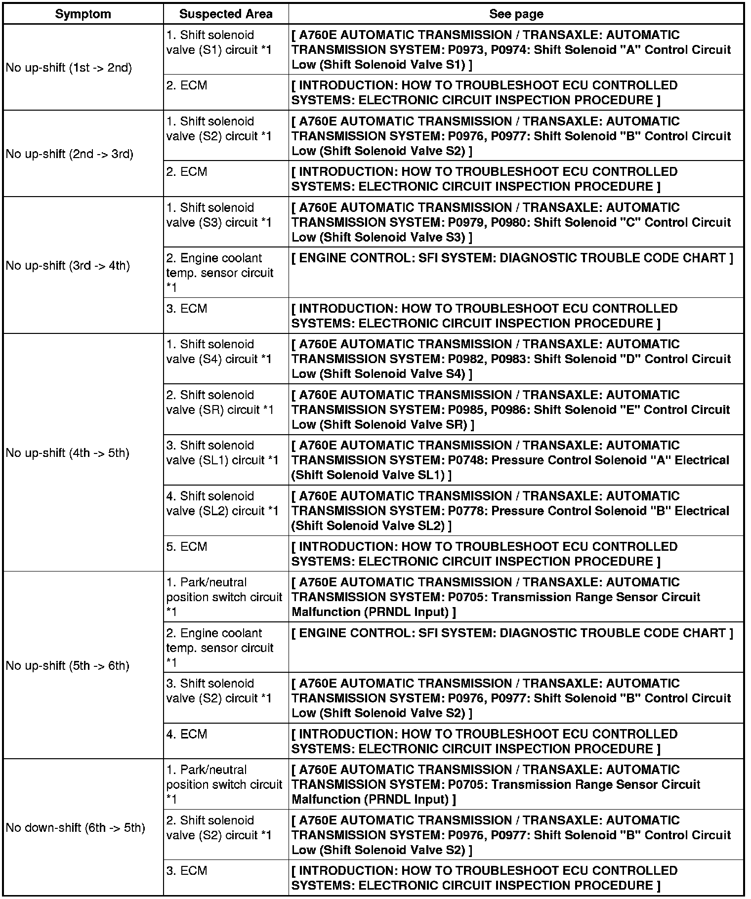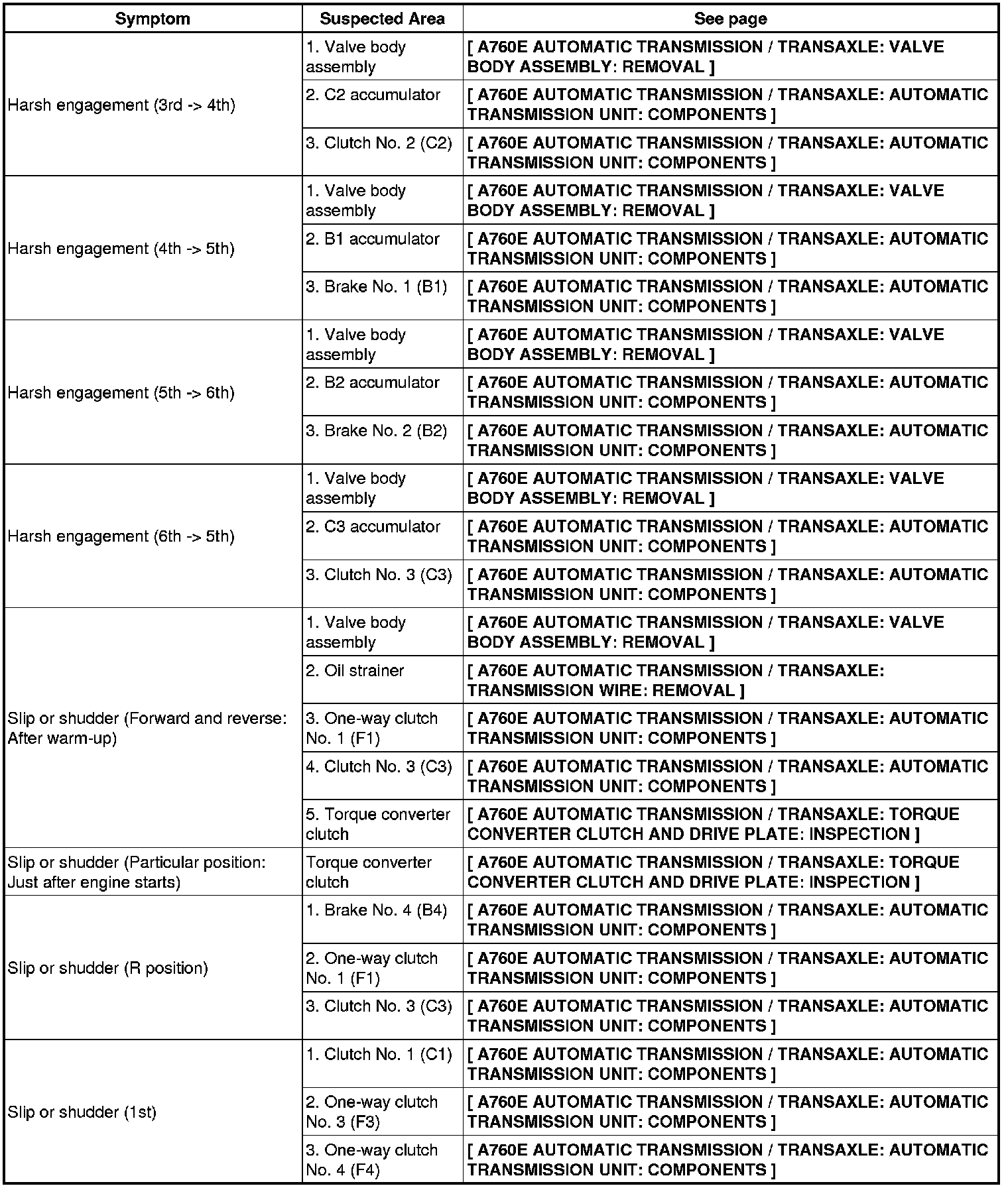 A760E AUTOMATIC TRANSMISSION / TRANSAXLE: AUTOMATIC TRANSMISSION SYSTEM: PROBLEM SYMPTOMS TABLE
