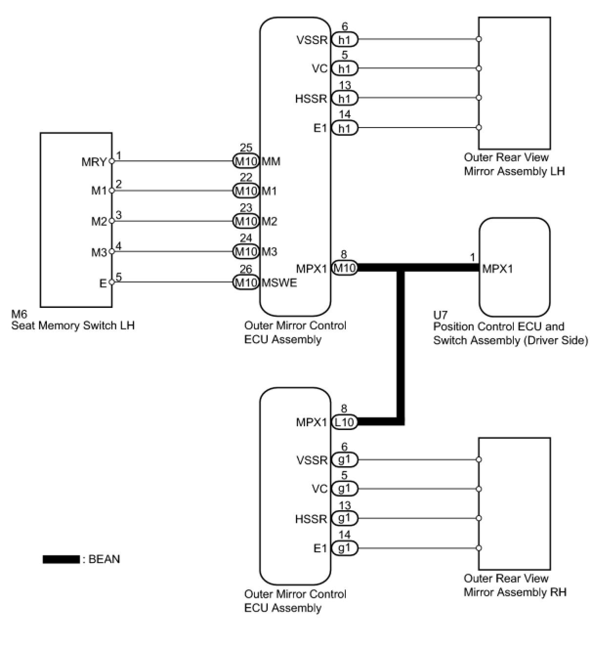 The outer mirror control ECU assembly monitors each seat memory switch status. If a seat memory switch is operated, the outer mirror control ECU assembly sends the seat memory switch signal to the position control ECU and switch assembly through the multiplex communication line. Based on the seat memory switch signal, the position control ECU and switch assembly sends back a mirror position storage signal to the outer mirror control ECU assembly through the multiplex communication line. When the outer mirror control ECU assembly receives the mirror position storage signal, the mirror surface position will be memorized based on the mirror position signal sent from the mirror position sensors built into each outer rear view mirror assembly.