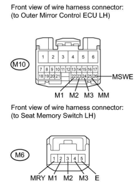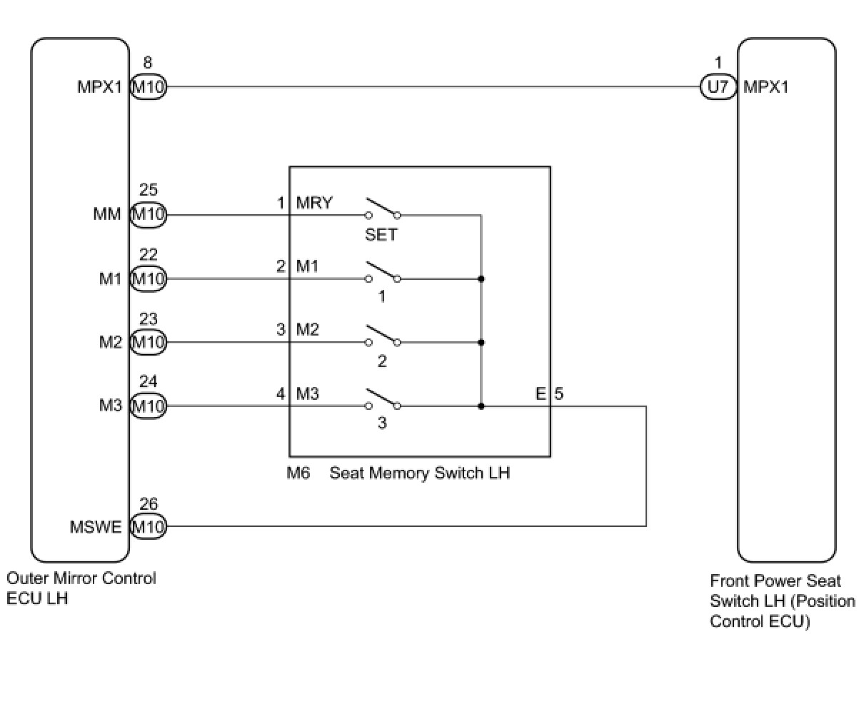 The seat memory switch LH sends signals to the outer mirror control ECU LH via the multiplex communication system to memorize a given seat position. This memory system does not use a position sensor. The seat position is detected by counting pulses that are output when the motor turns. If there is no pulse output from the motor, the motor will stop operating. The seat memory switch LH is later used to send signals to the front power seat switch LH (position control ECU) to return the seat to one of the memorized positions. The power seat memory switch LH operation can be performed only when the engine switch is on (IG) and the shift lever is in P.