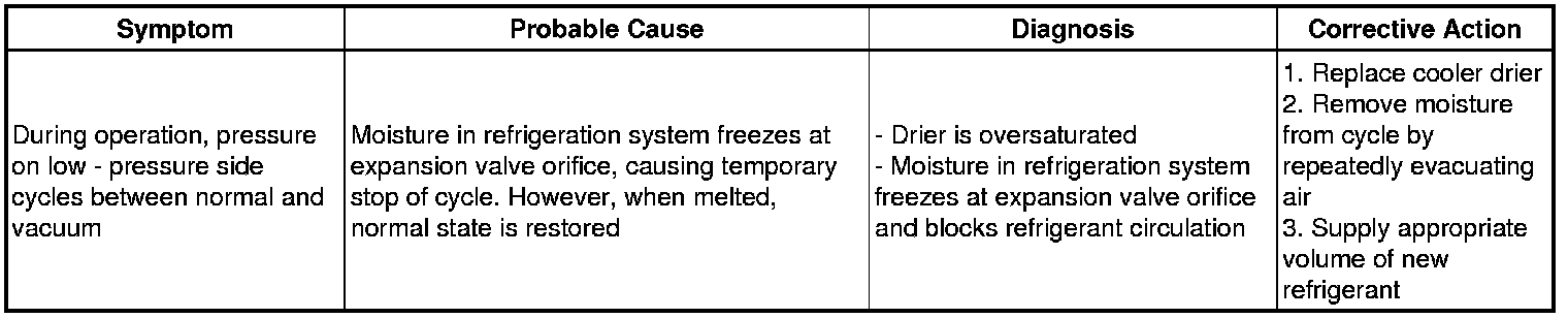 (2) The A/C system periodically changes between normal and improper function due to moisture in the refrigeration system.