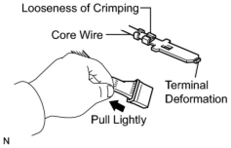 (2) Checking when a connector is disconnected: Check by pulling the wire harness lightly from the backside of the connector. Look for unlatched terminals, missing terminals, loose crimps or broken conductor wires. Check visually for corrosion, metallic or foreign matter and water, and bent, rusted, overheated, contaminated, or deformed terminals.