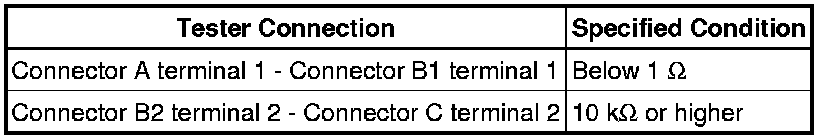 Measure the resistance while lightly shaking the wire harness vertically and horizontally. If the results match the preceding values, an open circuit exists between terminal 1 of connector A and terminal 1 of connector C.