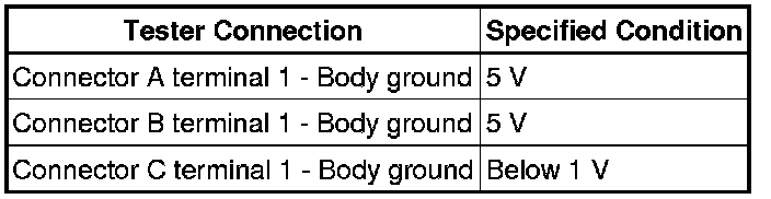 With each connector still connected, measure the voltage between the body ground and these terminals (in this order): 1) terminal 1 of connector A, 2) terminal 1 of connector B, and 3) terminal 1 of connector C.