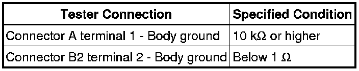* If the results match the values specified above, an open circuit exists between terminal 1 of connector B2 and terminal 1 of connector C.