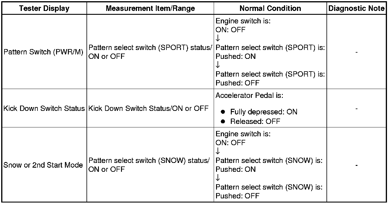 Using the Techstream to read the Data List allows the values or states of switches, sensors, actuators and other items to be read without removing any parts. This non-intrusive inspection can be very useful because intermittent conditions or signals may be discovered before parts or wiring is disturbed. Reading the Data List information early in troubleshooting is one way to save diagnostic time.