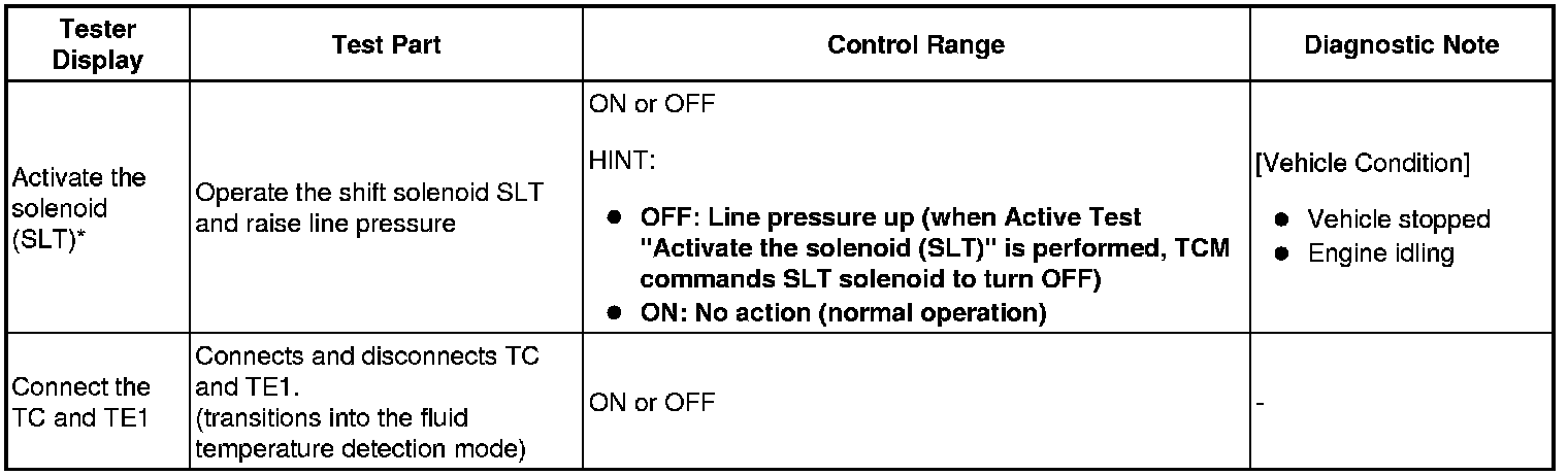 *: The "Activate the solenoid (SLT)" Active Test is performed to allow confirmation that the line pressure changes. The line pressure changes are confirmed using the same SST that is used for the Hydraulic Test Hydraulic Test.