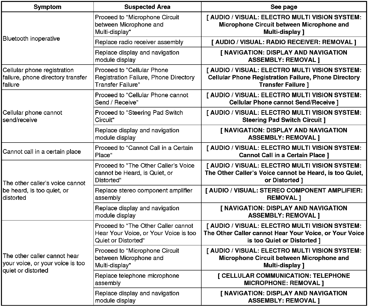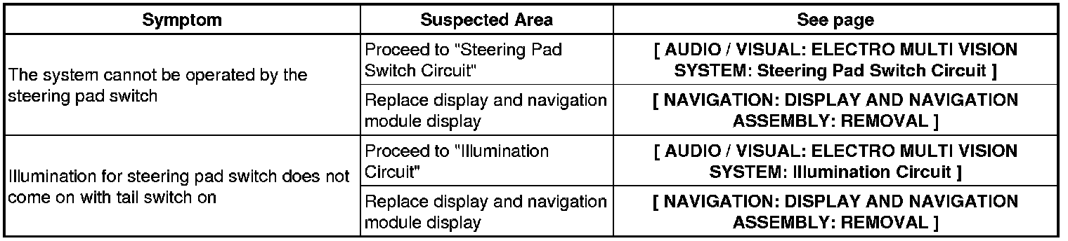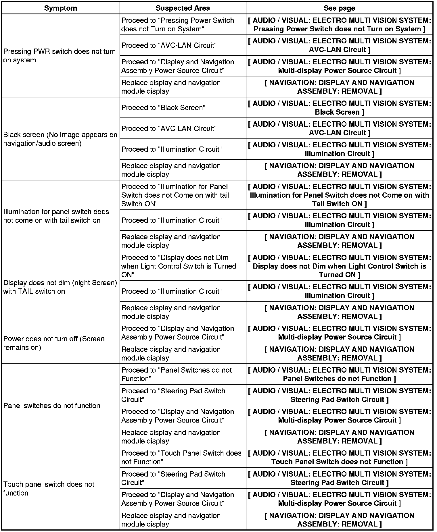 AUDIO / VISUAL: ELECTRO MULTI VISION SYSTEM: PROBLEM SYMPTOMS TABLE