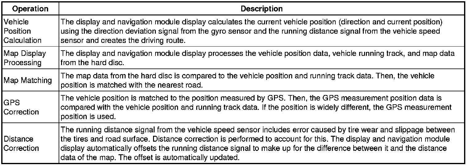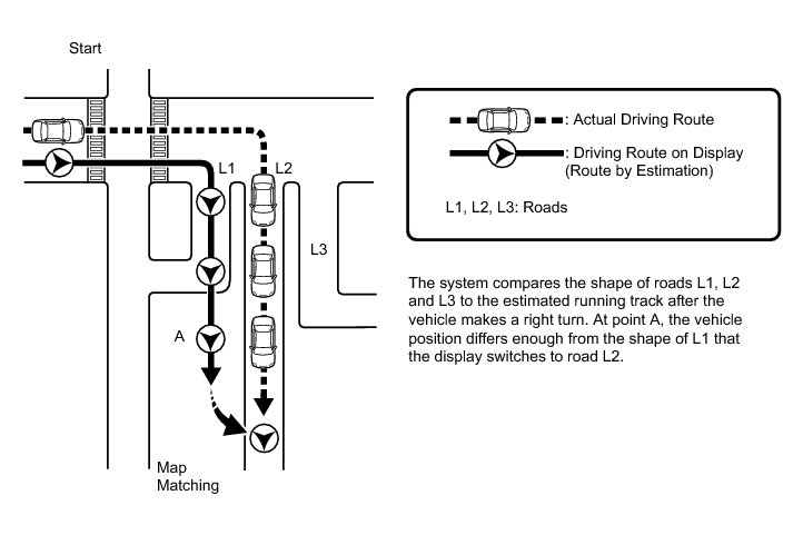 The current driving route is calculated by autonomous navigation (according to the gyro sensor and vehicle speed sensor) and GPS navigation. This information is then compared with possible road shapes from the map data on the hard disc and the vehicle position is set onto the most appropriate road.