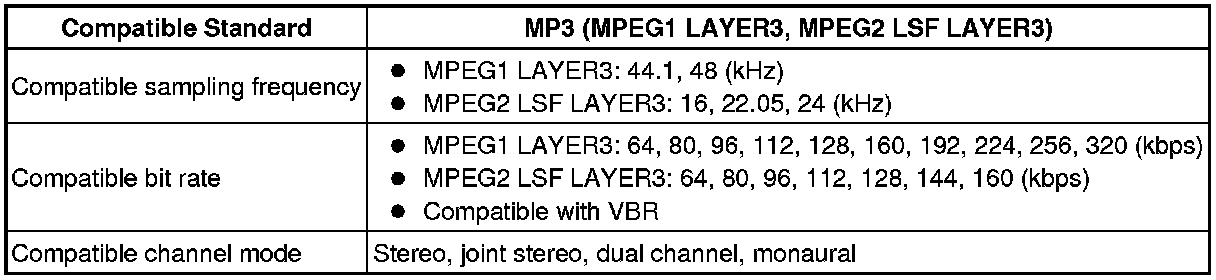 * As for MP3/WMA files written in any unlisted format, the contents of the files may not be played normally or the file names or folder names may not be displayed correctly.