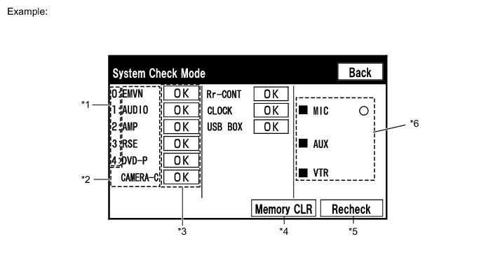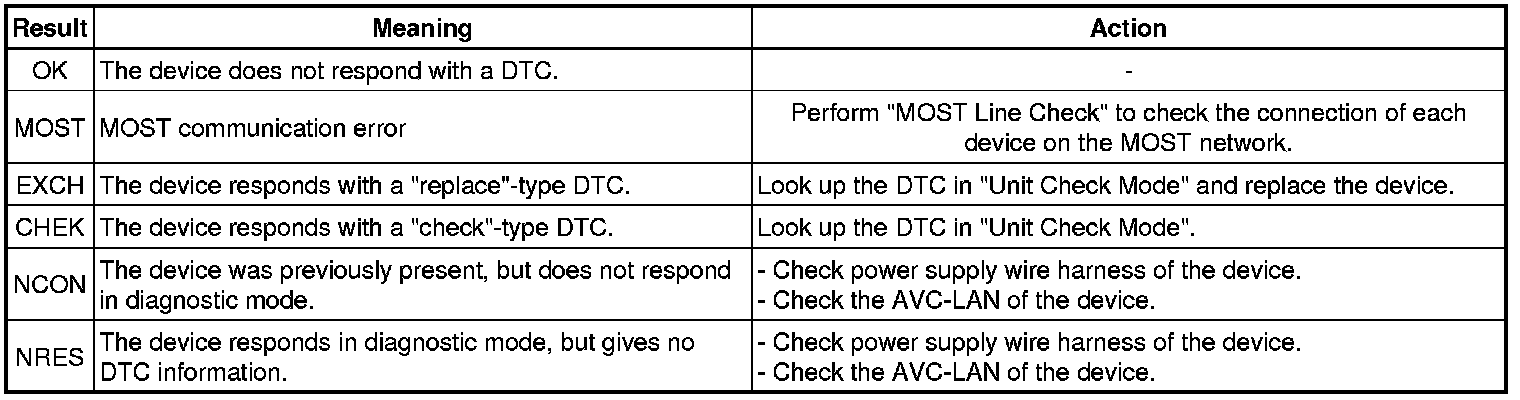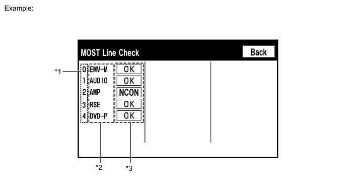* The device name and result will not be displayed if there is no system registration record and no response for the connection check during the MOST line check even if the device is connected to the MOST network.