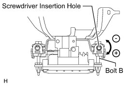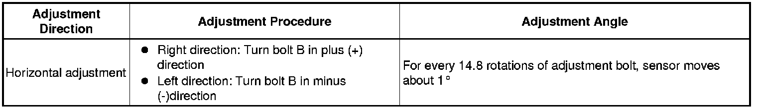 * If "LEFT SIDE: 1.0°" is displayed, the divergence is 1.0° in the left direction. Turn bolt B approximately 14.8 turns to the negative (-) side.