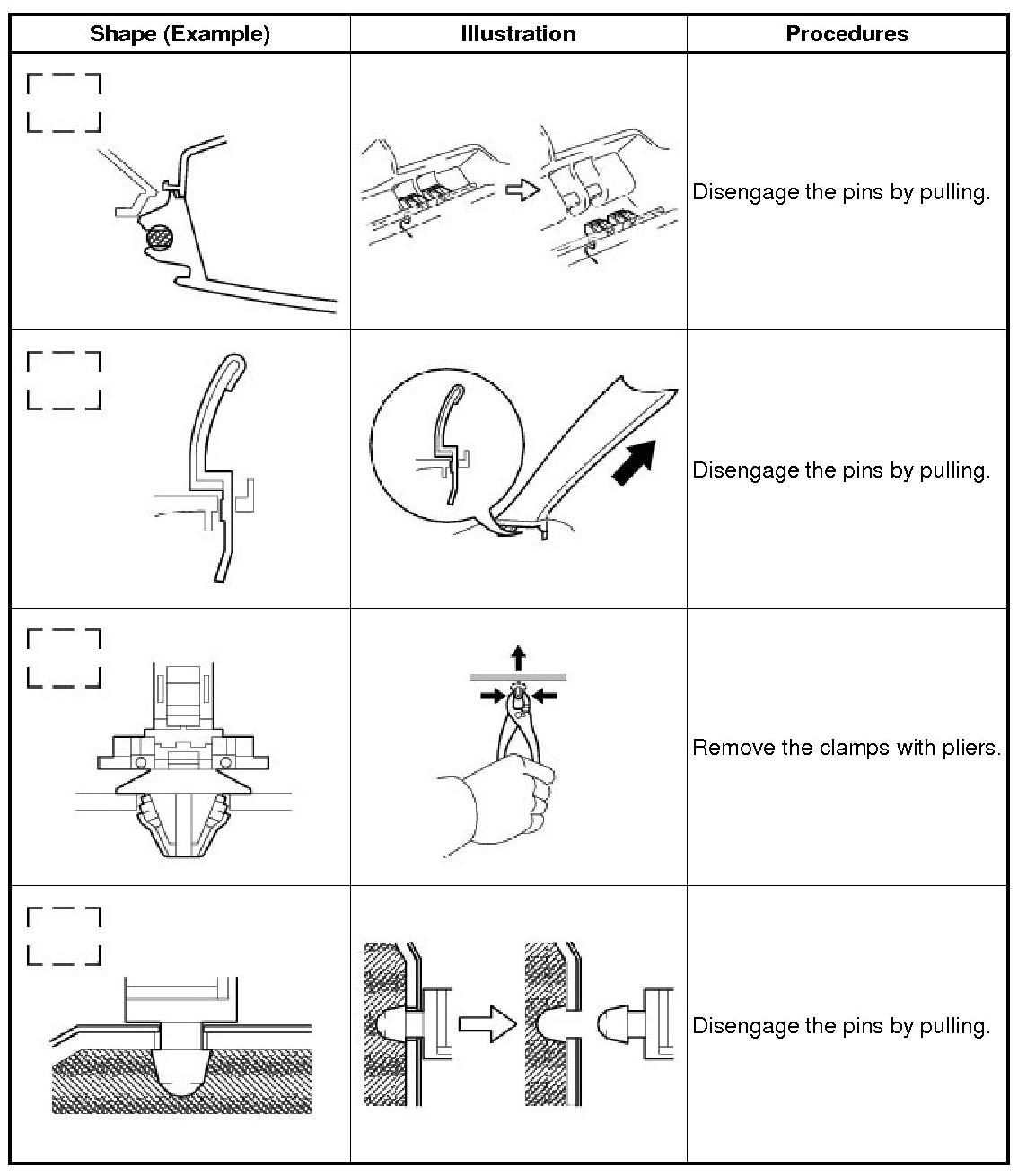 (1) The removal and installation methods of typical claws used for vehicle body parts are shown in the table below.