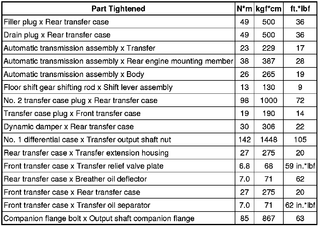 SERVICE SPECIFICATIONS: LF1A TRANSFER: TORQUE SPECIFICATIONS